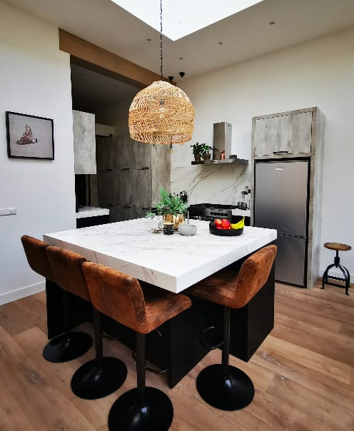 Mijn favoriete plek in huis is de woonkeuken. Ik houd van een keuken waarin je kunt leven, entertainen, gezellig koken en eten – alle belangrijke zaken worden besproken rondom het keukeneiland! De combinatie van het stoere staal, beton, met het klassieke marmer en warm eikenhout vind ik prachtig. De zithoek met de bakstenen muur is een echte blikvanger en één van mijn favoriete momentjes van de dag is dat half uurtje me-time op mijn blauwe bank in de zon met een drankje, net voordat de kinderen thuiskomen van school.